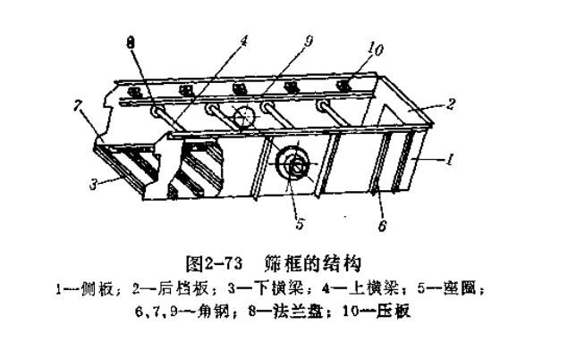 图2-73是双层单轴惯性振动筛的筛框结构。它是由侧板1、后挡板2、下横梁3和上横梁4组合而成。侧板是用钢板制成,利用横梁将两块侧板连接起来,使筛框成整体结构。侧板用以传递激振力,在它的中部,铆接有座圈5,激振器就安装在座圈内。为了加强侧板的刚度,在座圈附近采用双层的钢板,并在适应部位铆接角钢6以补强。下横梁采用槽钢,上横梁用无缝钢管,并用角钢7和法兰盘8分别铆接在侧板上。上层筛面放置在侧板内侧的角钢上,并用压板10和木楔块将它固紧。下层筛网放置在下横梁上,用卡板拉紧(图2-77)。后挡板中间有能拆卸的后盖板,供清洗或检查筛面用。