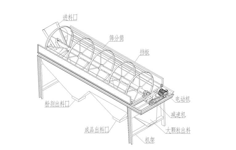 1.概述该系列滚筒式筛分机是肥料生产中的常用设备,其主要用于成品与返料的分离,也可实现产品的分级,使得产品均匀分类。滚筒筛是由滚筒、机架、漏斗、减速机、电动机等五个部分构成。物料由进料口进入滚筒后,一方面随着滚筒转动而被筛选,一方面粒度大的物料沿着滚筒的斜度向前流动,通过不同孔径的筛网逐步被筛出。物料筛出后落入各自的漏斗,然后由人工或皮带输送至成品区。该机采用了组合式筛网,便于维修与更换,其结构简单、操作方便、运转平稳,是肥料筛选分级的理想设备。